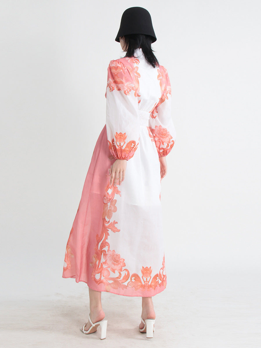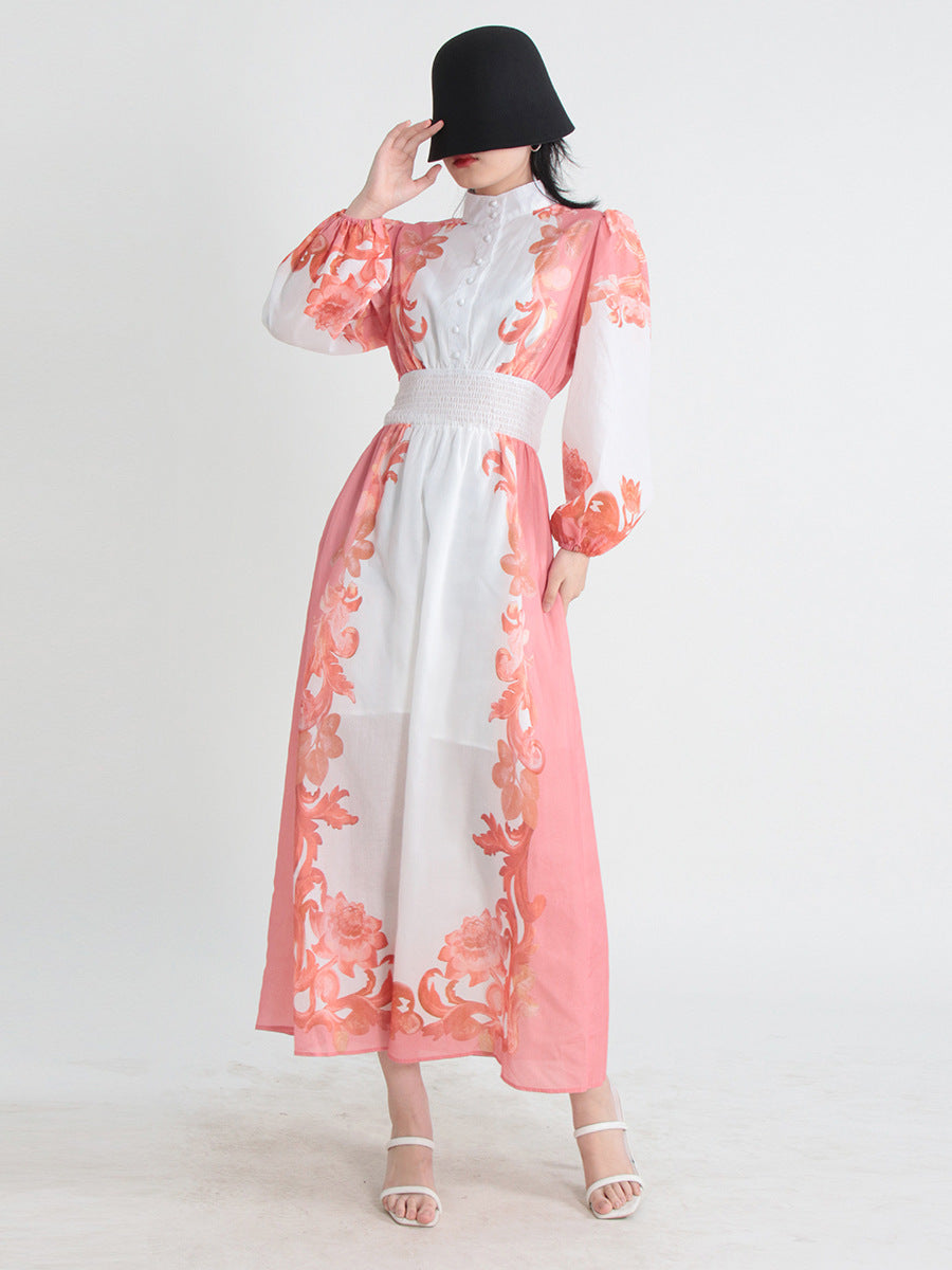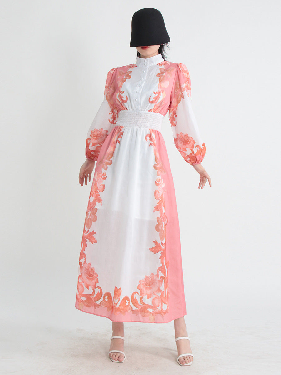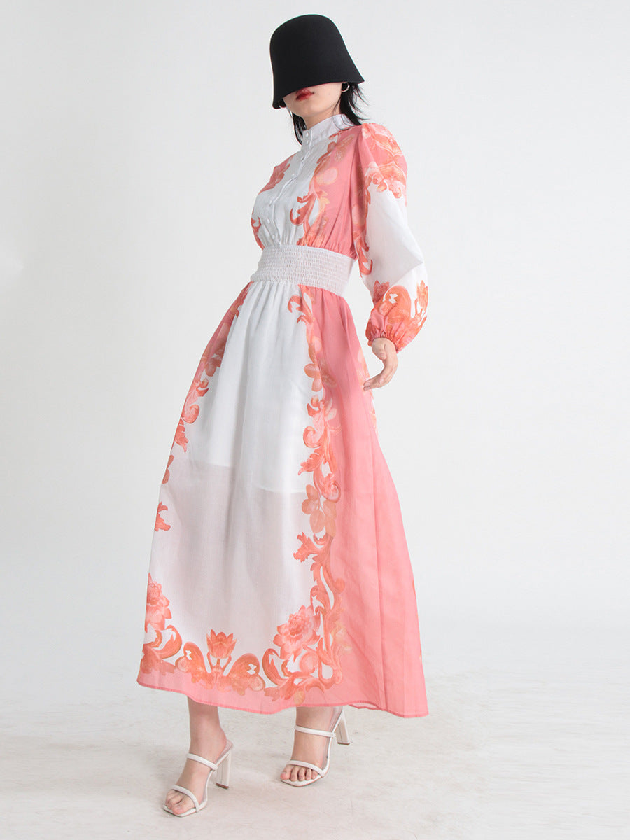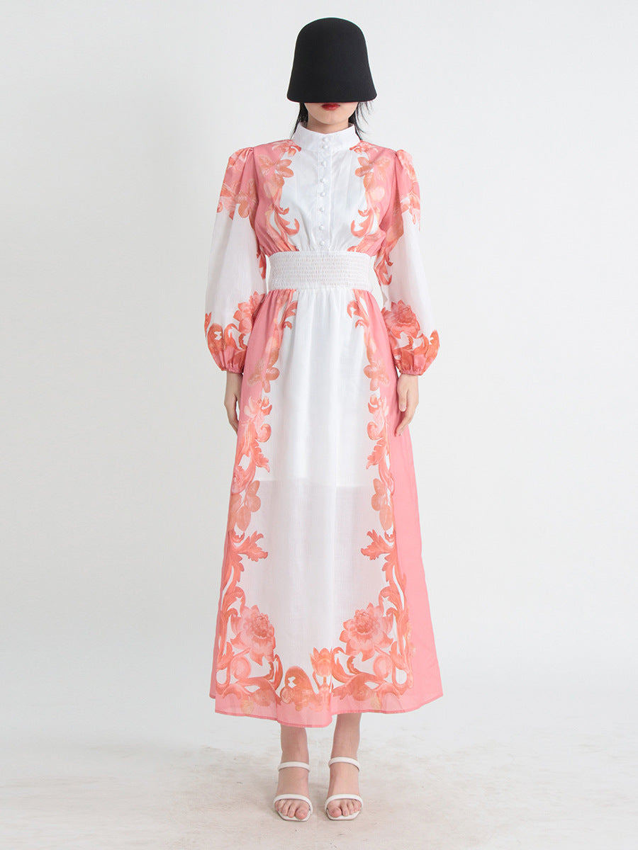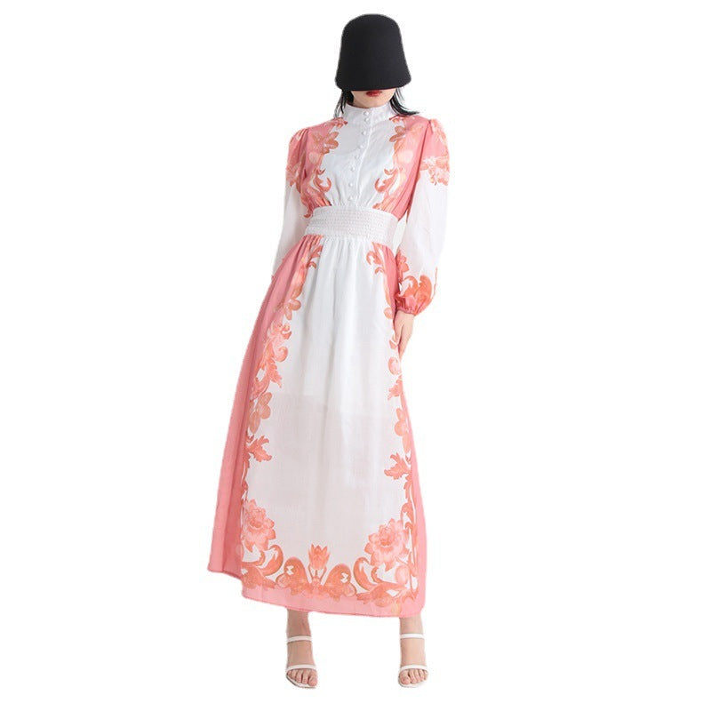 Summer Round Neck Long Sleeve Elastic And Waisted Design Single-breasted A- Line Dress For Women