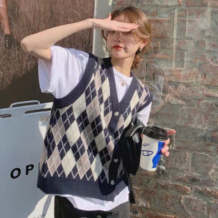 Fashion Diamond Plaid Sweater Vest Cardigan Jacket Women